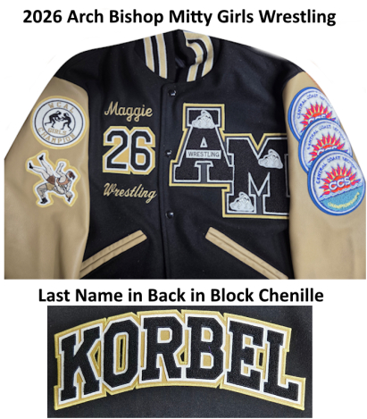 Archbishop Mitty Varsity Lettermen jackets available at Kim's Kustom Embroidery at Hayward, CA. Open Monday to TUESDAY 10 to 5 pm. Some Saturday appointments available.