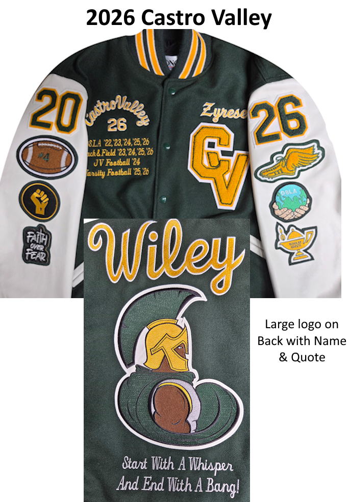 Castro Valley Trojans Varsity Lettermen jackets available at Kim's Kustom Embroidery at Hayward, CA. Open TUESDAY to Friday 10 to 5 pm. Some Saturday appointments available.