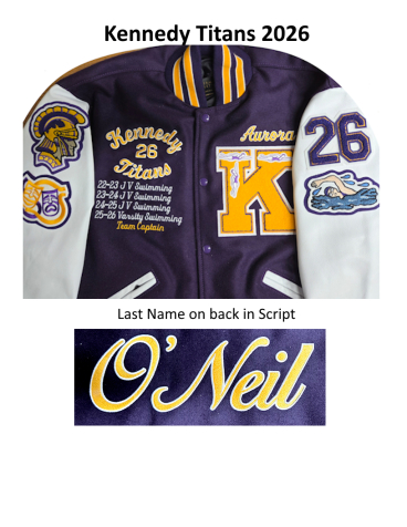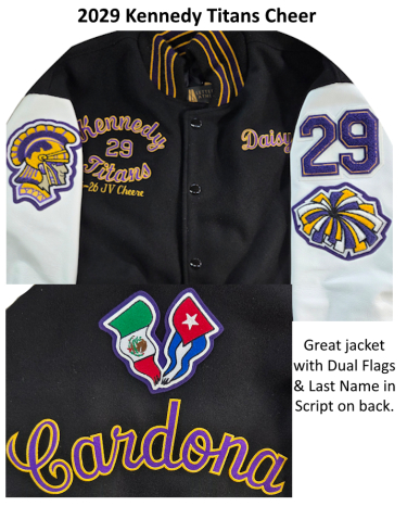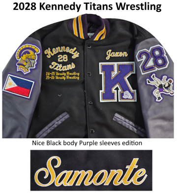 Kennedy Titans Varsity Lettermen jackets available at Kim's Kustom Embroidery at Hayward, CA. Open TUESDAY to Friday 10 to 5 pm. Some Saturday appointments available.