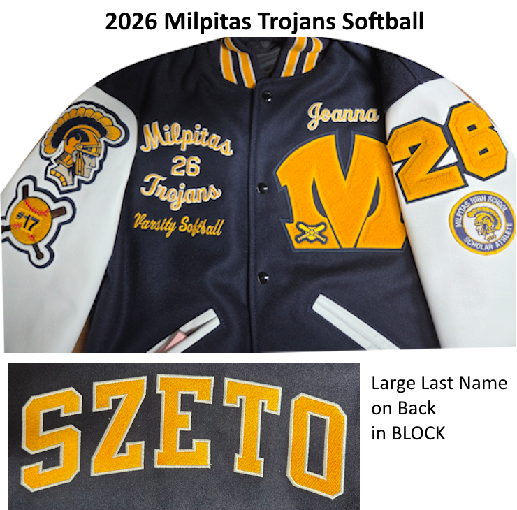 Milpitas Trojans Varsity Lettermen jackets available at Kim's Kustom Embroidery at Hayward, CA. Open TUESDAY to Friday 10 to 5 pm. Some Saturday appointments available.