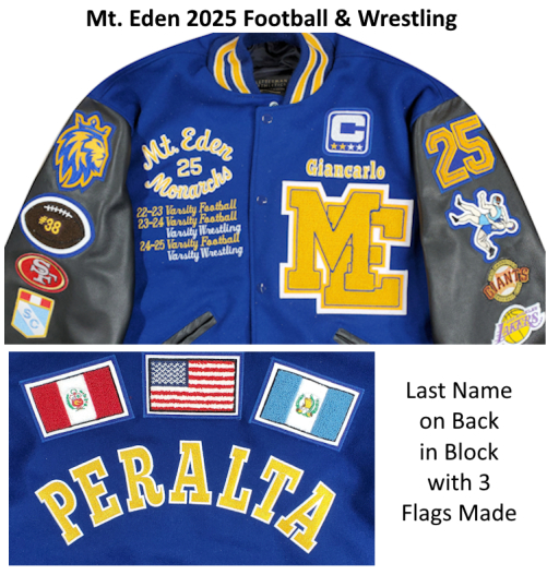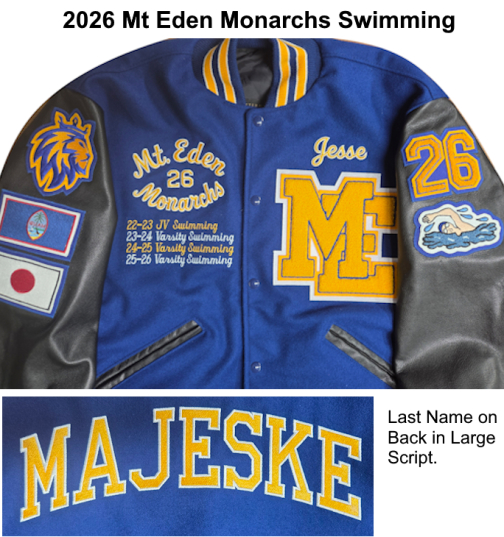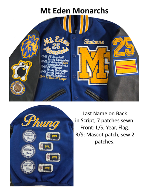 Mount Edem Monarchs Varsity Lettermen jackets available at Kim's Kustom Embroidery at Hayward, CA. Open TUESDAY to Friday 10 to 5 pm. Some Saturday appointments available.